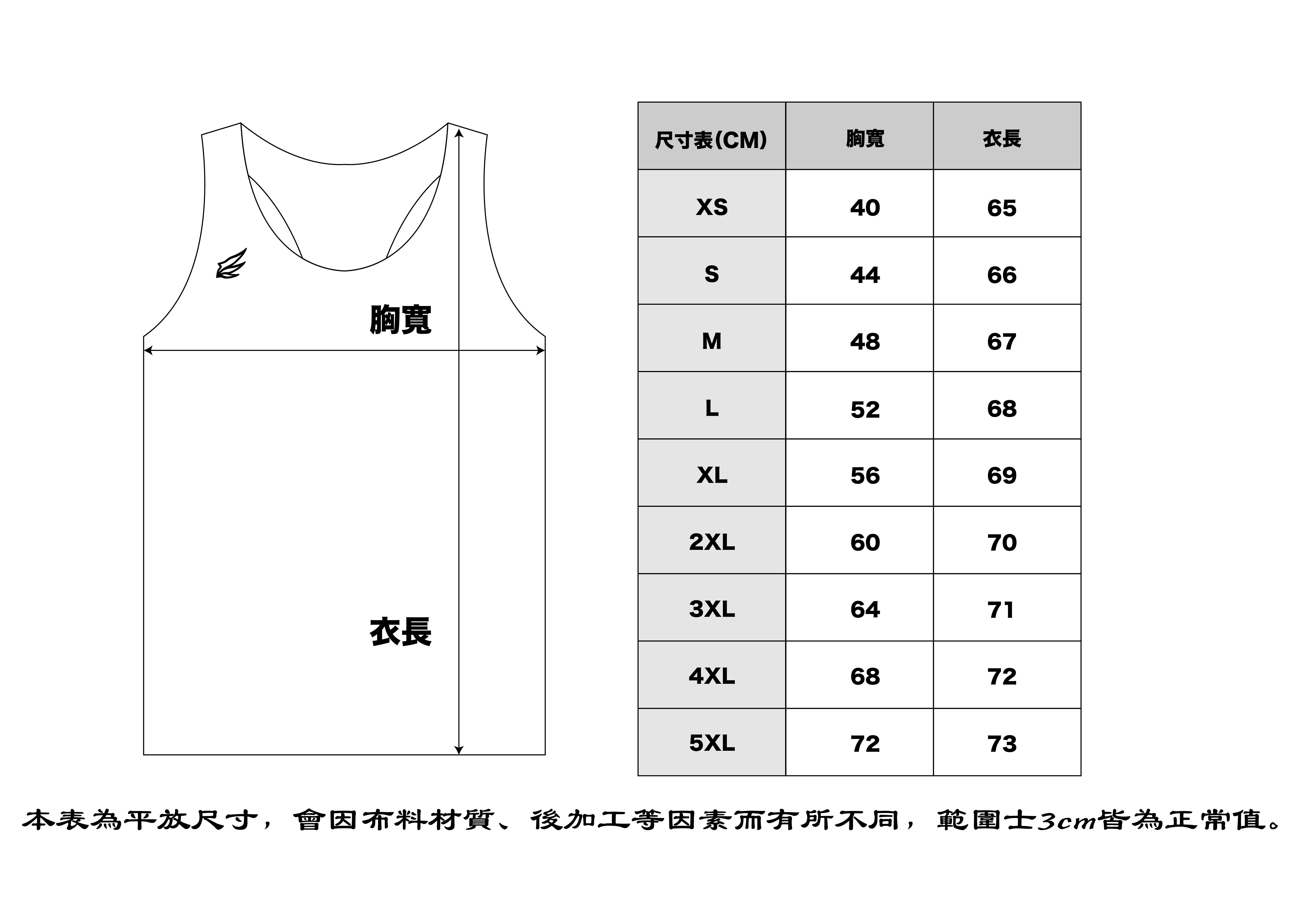 衣體 / XS~5L,詳細規格見尺寸表。